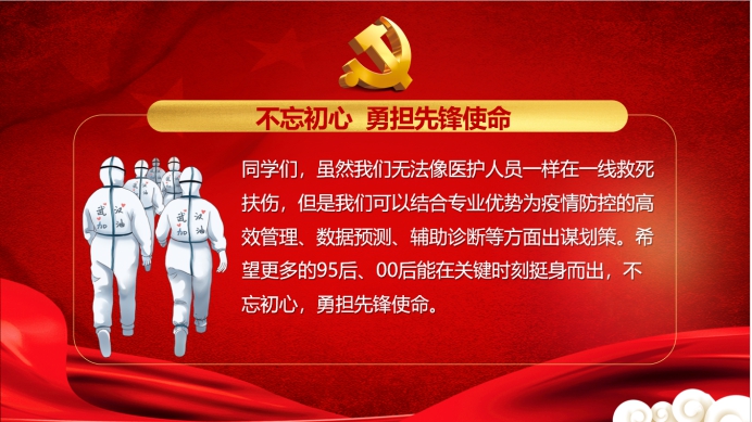 最后还鼓励同学们说,虽然我们无法像医护人员一样在一线救死扶伤,但是我们可以结合专业优势为疫情防控的高效管理、数据预测、辅助诊断等方面出谋划策。希望更多的95后、00后能在关键时刻挺身而出,不忘初心,勇担先锋使命。