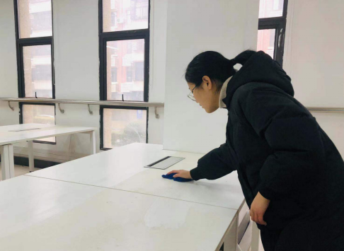 院楼内部,同学们拿着抹布和扫把对院楼的室内进行打扫,认真细致地清理院楼每一层每一个角落。同学们齐心合力,擦桌子、椅子,擦栏杆、门框,扫走廊、楼梯,为绿植浇水,让装修完成的院楼展现出它的风采。
