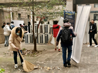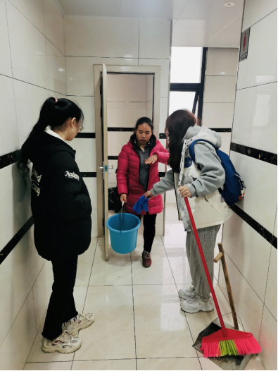 同学们不顾冬天的寒冷,热火朝天地开始打扫院楼一层的天井。男生们将楼道内的杂物搬到天井里摆放整齐,女生们清理天井地上的白色垃圾和枯叶。不到半个小时,楼道里的杂物都被整整齐齐地摆放在干干净净的天井里。同学们拿着清扫工具合影留念,脸上洋溢着劳动后幸福的笑容。