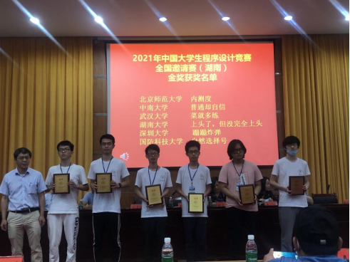 在2021 年中国老员工程序设计竞赛全国邀请赛(湖南)中,有来自全国双一流高校如:国防科大、武汉大学、北京师范大学、北京理工大学、华中科大、天津大学、厦门大学、中南大学及省内各高校近200支队伍参加了比赛,威廉希尔williamhill官方网站两支队伍获得一金一铜的好成绩,其中威廉希尔williamhill官方网站王文斌、陈雨航、欧健组成的队伍以第四的好成绩获得金牌。