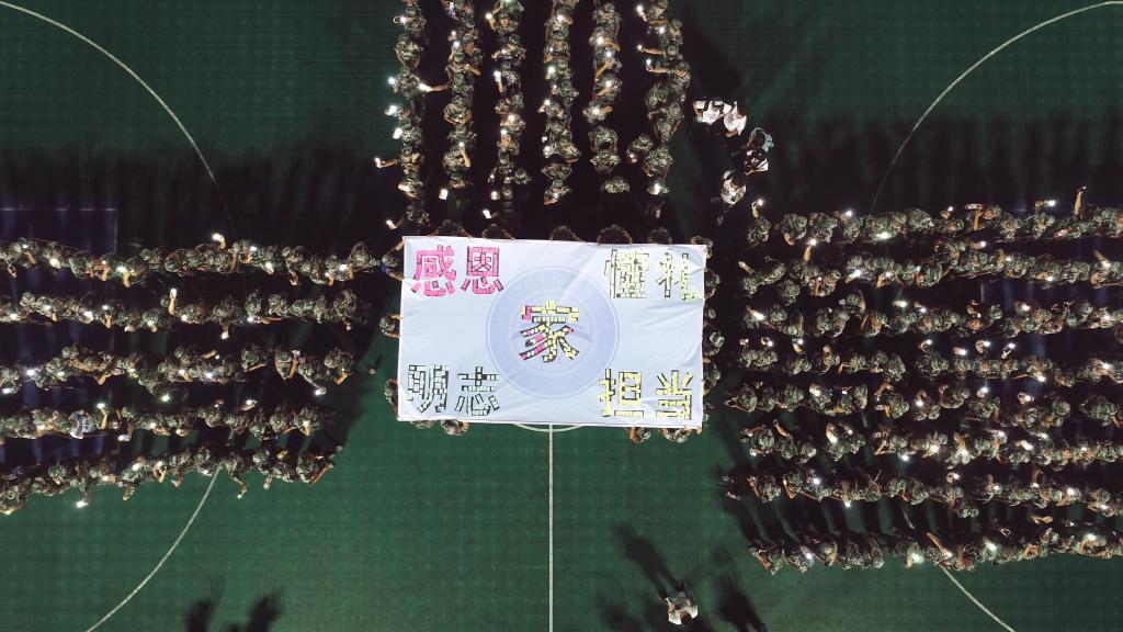 晚上,合唱练习之后,所有的新生集合带队围在了放在篮球场中央的喷绘,在主持人的指挥下,有序地用便利贴粘出了9个大字。新生们向悬浮在空中的无人机航拍挥舞着手机的闪光灯,像是一片光的海洋。这时,18级新生辅导员李耀老师带领大家喊了信息院的口号“青春站岗,热血飞扬,先锋信息,时代领航!”,连续三遍,五百多人发自肺腑的呐喊响彻荫马塘篮球场的上空,回响不绝。这是来自信息人的呐喊!