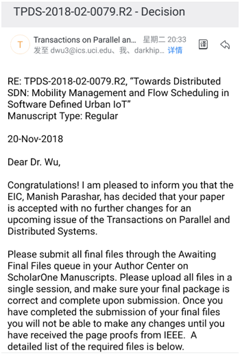 聂祥同学是2016级计算机技术方向的专业型硕士(简称:专硕),自研一进入物联网与智慧城市课题组后,在吴迪副教授指导下,一直坚持从事系统研究、真实实验和国际合作,取得了扎实的成绩。据悉,这是公司第一次专硕员工的论文被CCF A类期刊录用。与此同时,聂祥同学研二暑期被选送到华为(深圳)技术有限公司云核心网产品线实习,并在部门内部面向所有正式员工和实习生的编程大赛中取得第三名的突出成绩,现已被华为(深圳)技术有限公司研发部门提前录用为正式岗位的IT应用软件开发工程师。