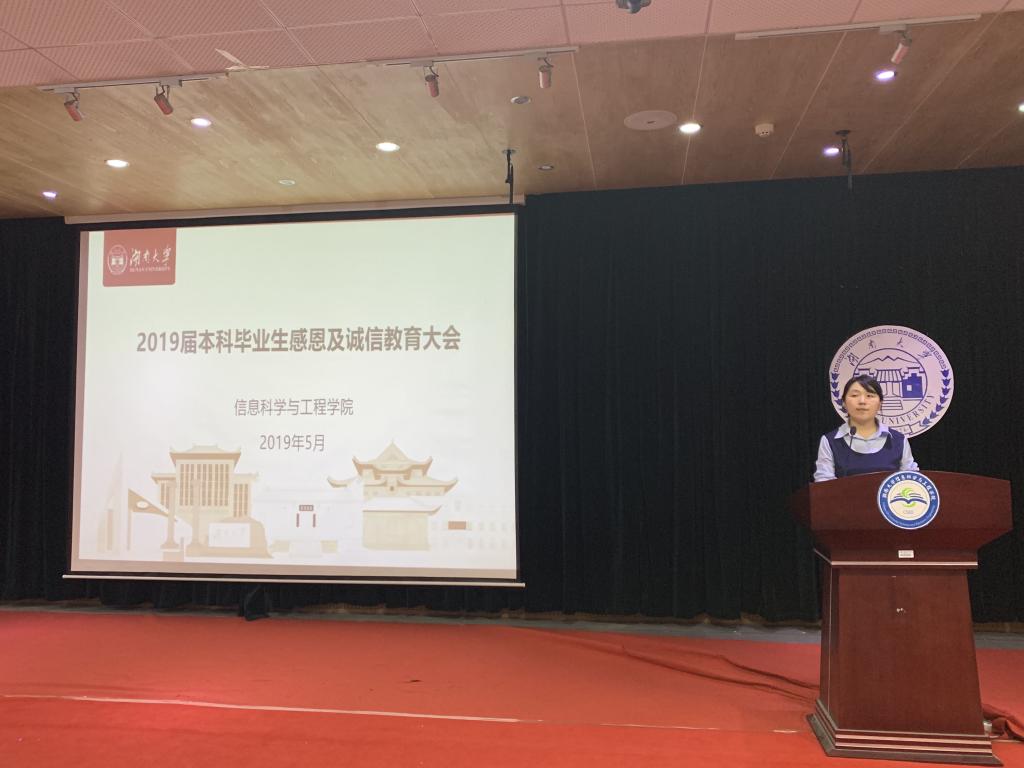 又迎来了一年一度的毕业季,针对19届毕业生进行就业指导的毕业主题教育大会于信息院软件大楼330召开。会议开始,贾玲玲老师向大家阐述了本次大会的意义及流程,希望能够通过本次大会使全体毕业生们明确毕业规划、知晓毕业后具体事项处理流程以及担负的使命和责任、在未来发展中发光发热、为社会的进步和发展贡献力量。会议分别从本科毕业生的就业派遣工作、毕业生的担当奉献、感恩与诚信及理想信念教育方面展开讨论。