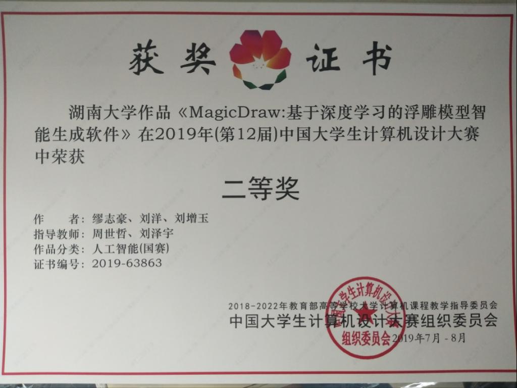 本届大赛由教育部高等学校全国大学计算机课程教学指导委员会主办,全国决赛由吉林大学承办。初赛吸引了来自全国各地高校的1万多支队伍报名参加。公司的参赛作品”MagicDraw:基于深度对抗网络的笔画式浮雕建模”(指导老师:周世哲,领队老师:李小英)首先在6月中旬的中南赛区获得了一等奖,并入围全国总决赛。来到吉林大学的决赛队伍包括了来自威廉希尔williamhill官方网站、上海交通大学、武汉大学、哈尔滨工业大学、同济大学、大连理工大学,华中科技大学、中国人民解放军国防科技大学、西安电子科技大学等一系列高校的899支参赛队伍,可谓强手如云。经过决赛答辩和作品演示,最终公司参赛队伍的作品获得了全国二等奖。