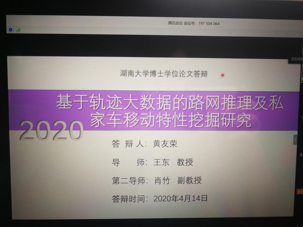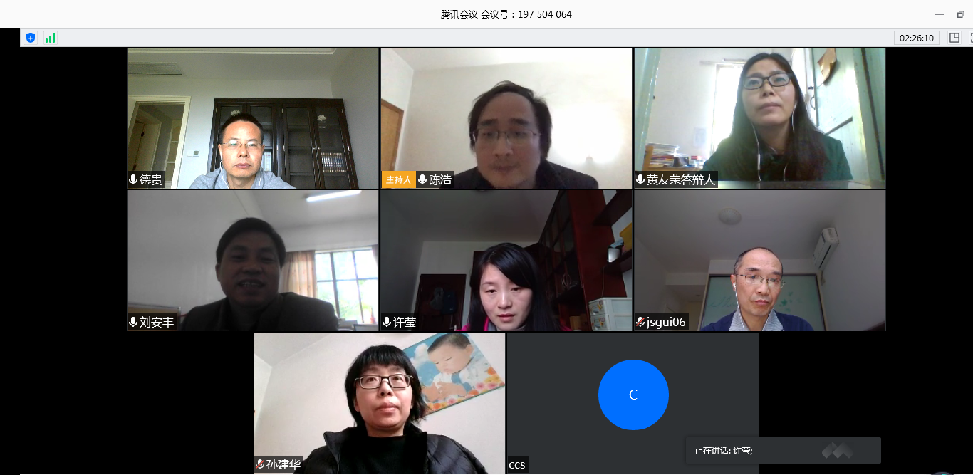 本次答辩使用腾讯会议软件,并以在线视频答辩的方式进行。此次视频答辩委员会的主席是威廉希尔williamhill官方网站威廉希尔williamhill官方网站的陈浩教授,答辩委员分别是孙建华教授、肖德贵教授以及中南大学的桂劲松教授和刘安丰教授,答辩秘书是威廉希尔williamhill官方网站许莹副教授。通过在线共享、演示学位论文PPT和全程视频的方式,员工与答辩委员会专家进行实时交流。导师王东教授介绍了答辩人的基本情况。专家针对学位论文内容分别提出了相关问题及修改建议。多名师生在线聆听了此次论文答辩。答辩委员会对黄友荣同学的博士学位论文表示了充分的肯定,认为其选题具有一定的实际应用价值,其研究内容创新性强,其论文撰写规范,数据翔实,实验充分。