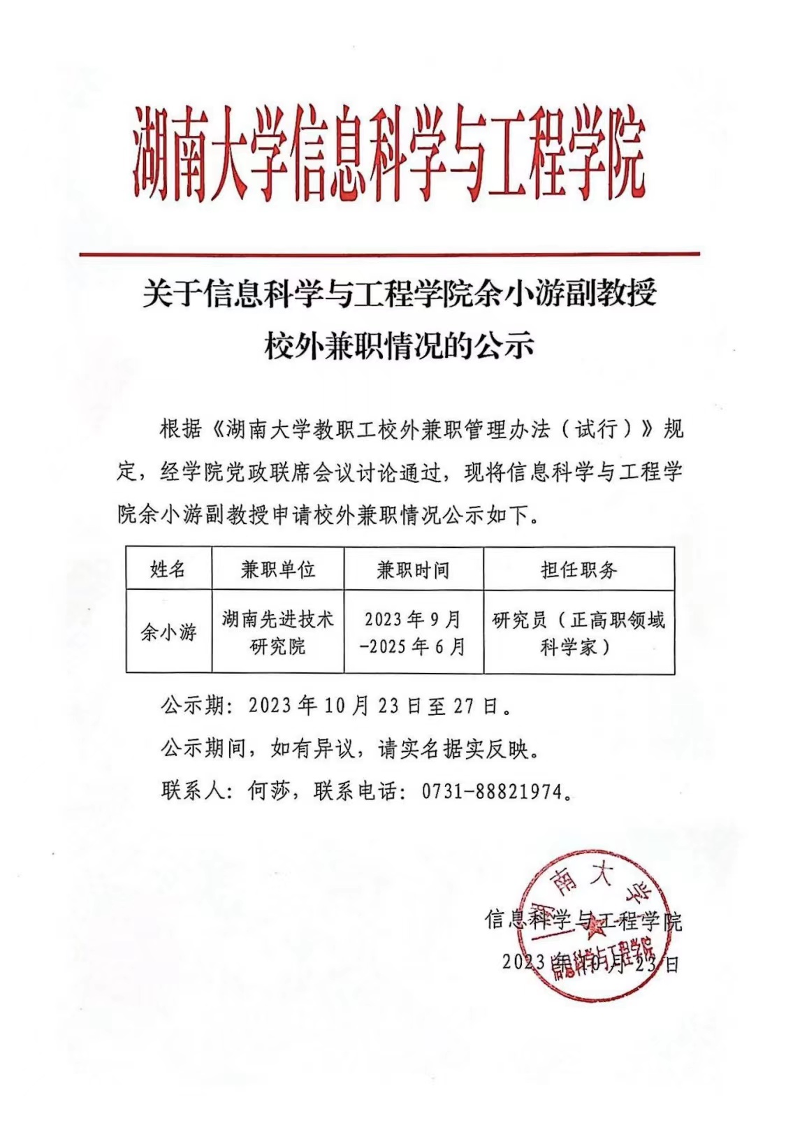 关于威廉希尔williamhill官方网站余小游副教授校外兼职情况的公示