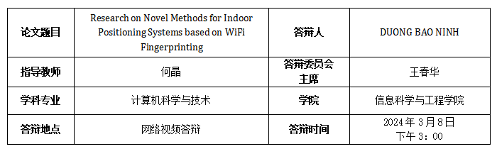 [5]. Duong Bao Ninh, Jing He, Luong Nguyen Thi, Seon-Woo Lee, Khanh Nguyen-Huu. “Evaluation of Valued Tolerance Rough Set and Decision Rules Method for WiFi-Based Indoor Localization in Different Environments,”. In: Nguyen, T.D.L., Verdú, E., Le, A.N., Ganzha, M. (eds) Intelligent Systems and Networks. ICISN 2023. Lecture Notes in Networks and Systems, vol 752. Springer, Singapore, pp. 186-194, Aug. 2023.
