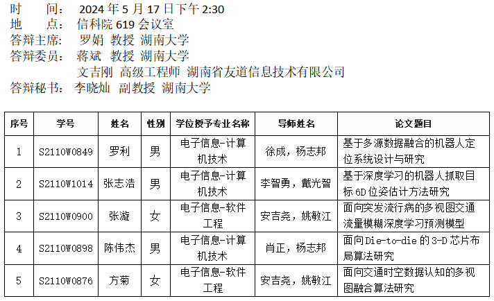 威廉希尔williamhill官方网站(计算机工程系)2024年5月17日硕士答辩公告